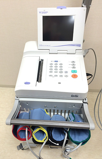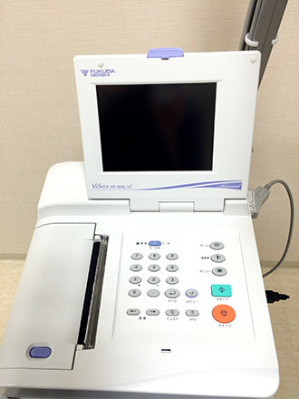 心臓の動きを電気的な波形にあらわして記録し、それによって心臓の動きを把握します。心疾患が疑われる場合にまず行うべき検査です。心臓肥大、狭心症、心筋梗塞、不整脈などの診断に役立ちます